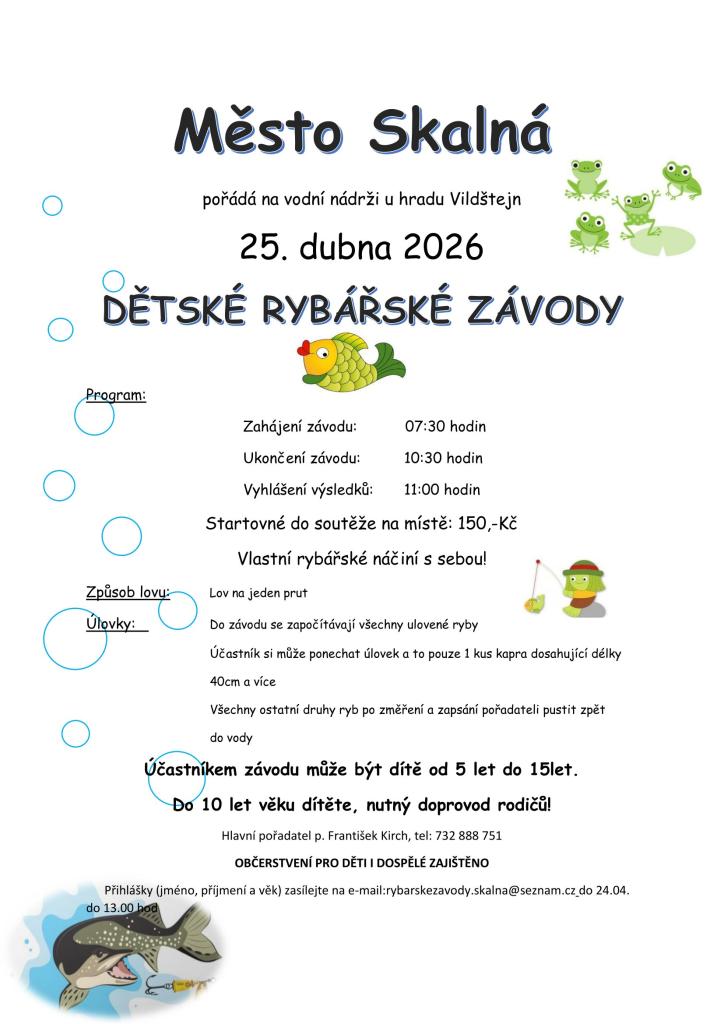 Zveme děti od 5 do 15 let na rybářské závody, které se uskuteční v sobotu 18. dubna 2026 na vodní nádrži u hradu Vildštejn. Zahájení v 7:00 hodin, vyhlášení výsledků v 11:00 hodin. Přihlášky zasílejte na e-mail: rybarskezavody.skalna@seznam.cz.