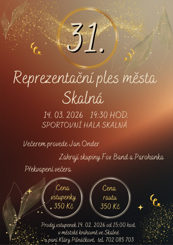 Město Skalná pořádá 31. reprezentační ples města Skalná, který se koná v sobotu 14. března 2026 od 19:30 hodin ve Sportovní hale Skalná.