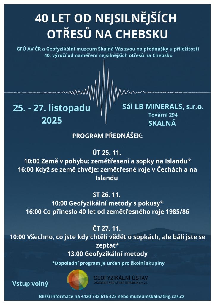 V sále společnosti LB MINERALS, s.r.o. ve Skalné vás čekají hned tři dny plné fascinujících příběhů o pohybu planety, o výzkumu českých i islandských zemětřesení a o tom, co vědci odhalili za čtyři desetiletí od nejvýznamnějšího zemětřesného roje z let 1985/86.