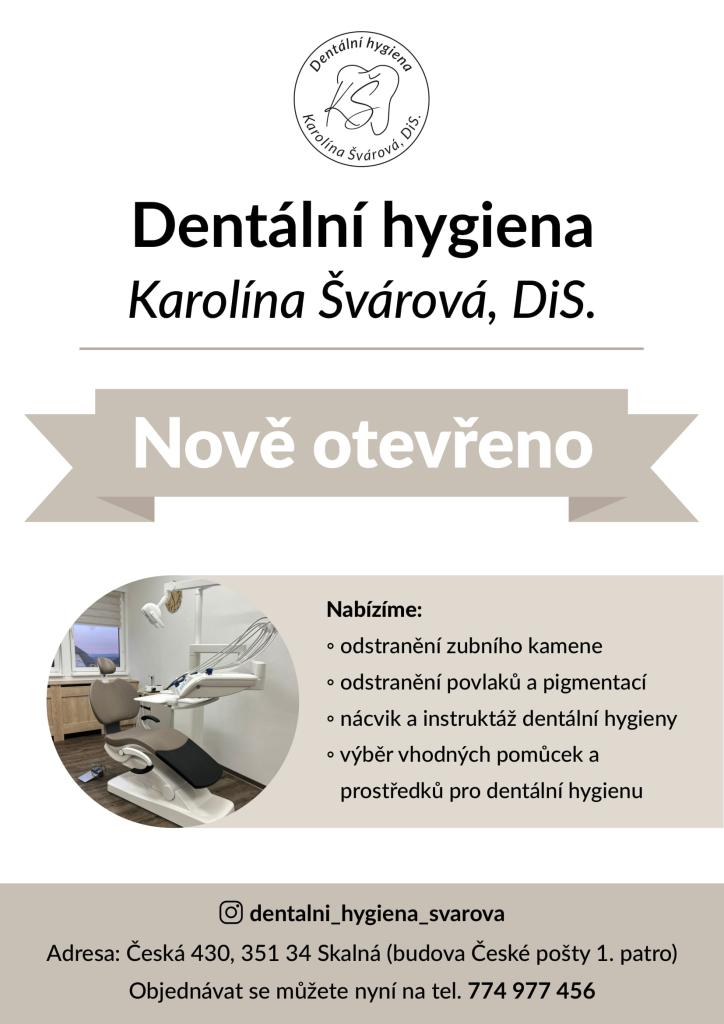Od 1. dubna 2025 bude ve Skalné otevřena nová ordinace dentální hygieny. Ordinaci povede Karolína Švárová, DiS. Služby zahrnují odstranění zubního kamene, povlaků a pigmentací, nácvik dentální hygieny a poradenství v oblasti výběru pomůcek. Objednávky přijímány na tel. 420 774 977 456.