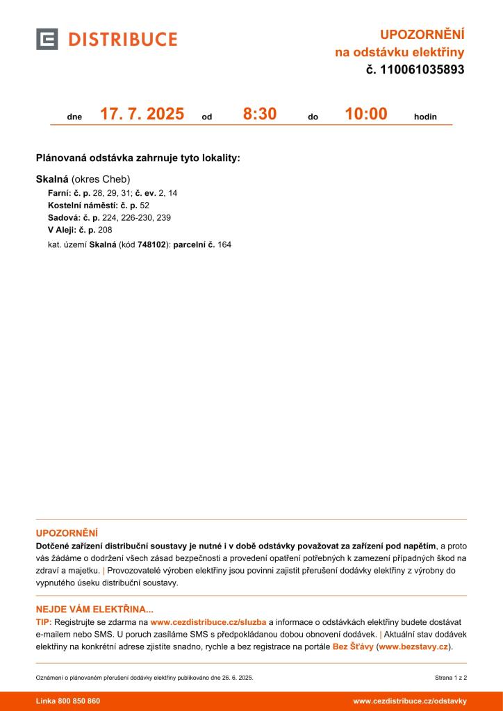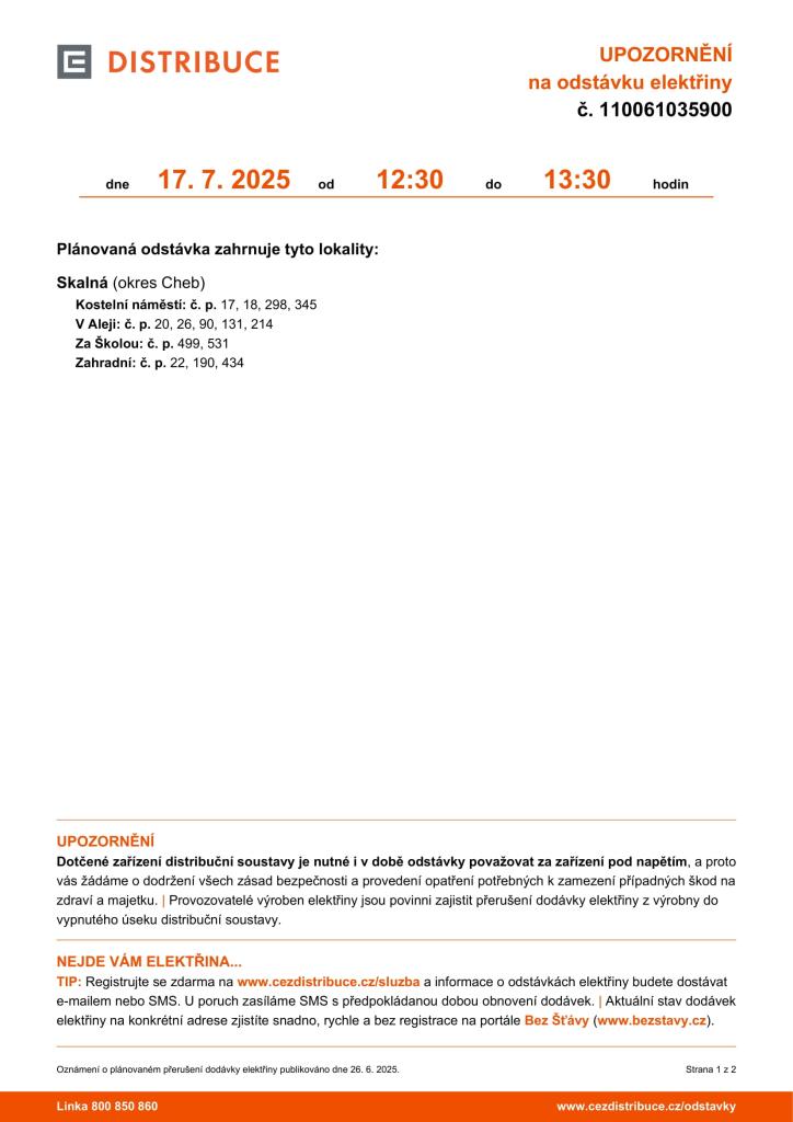 Upozorňujeme občany na plánované přerušení dodávky elektrické energie, které proběhne 17. 07. 2025 a 30. 07. 2025.