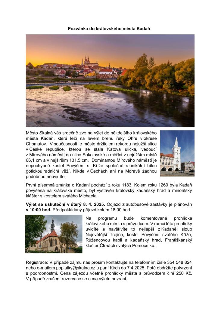 Město Skalná vás zve na výlet do královského města Kadaň, kde se můžete těšit na komentovanou prohlídku. Navštívíte místa jako Katova ulička, kostel Povýšení svatého Kříže a další historické památky. Odjezd je plánován na 8. dubna 2025 v 10:00 a cena výletu činí 250 Kč.