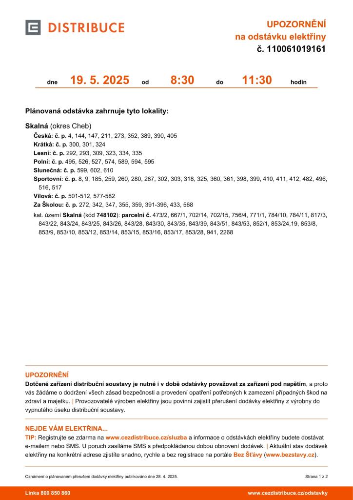 Důležité upozornění: I během odstávky je nutné považovat zařízení distribuční soustavy za pod napětím. Prosíme o dodržení všech bezpečnostních opatření.